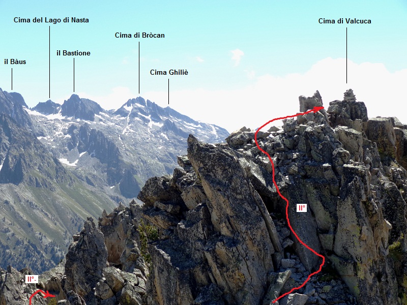 lungo la cresta sommitale. Pericolo di caduta sassi, casco obbligatorio.